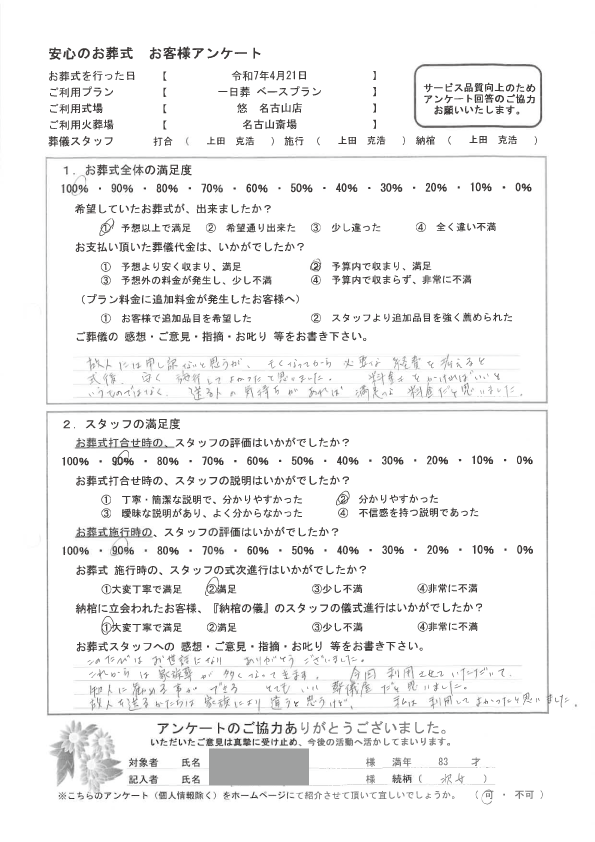 故人には申し訳ないと思うが、亡くなってから必要な経費を考えると式後、安く施行してよかったと思いました。料金をかければいいというものではなく、送る人の気持ちがあれば満足な料金だと思いました。